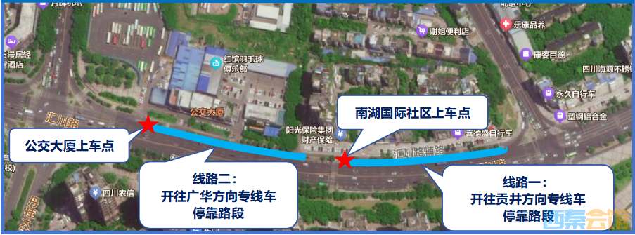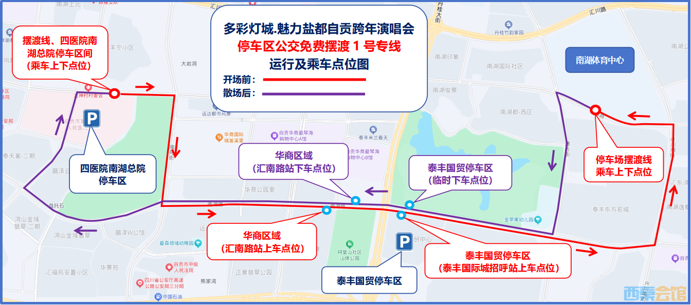 自贡公交高铁G1路(开往汇东公交枢纽站方向),在演唱会当天临时增加汇川路南湖国际社区公交站停靠,从高铁站就可以直达南湖体育中心周边公交站点;散场后,高铁G1路汇东公交枢纽站增加开往高铁站方向21:40、22:00两班车。