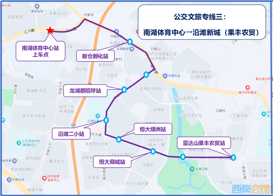 1.运行路线:南湖体育中心→板仓孵化园→公交招呼站→龙湖郡招呼站→沿滩第二小学→恒大绿洲→恒大商城→龙湖公园→雷达山果丰农贸